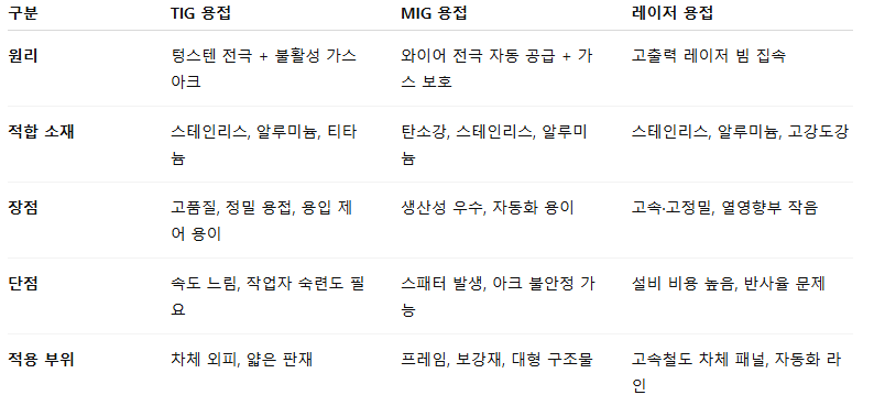 철도차량 제조에서 주로 활용되는 용접 방식은 TIG(Tungsten Inert Gas) 용접, MIG(Metal Inert Gas) 용접, 레이저(Laser) 용접이다. 각각의 방식은 차체 소재, 생산 효율, 품질 요구사항에 따라 선택되며, 다음과 같은 특성을 가진다.